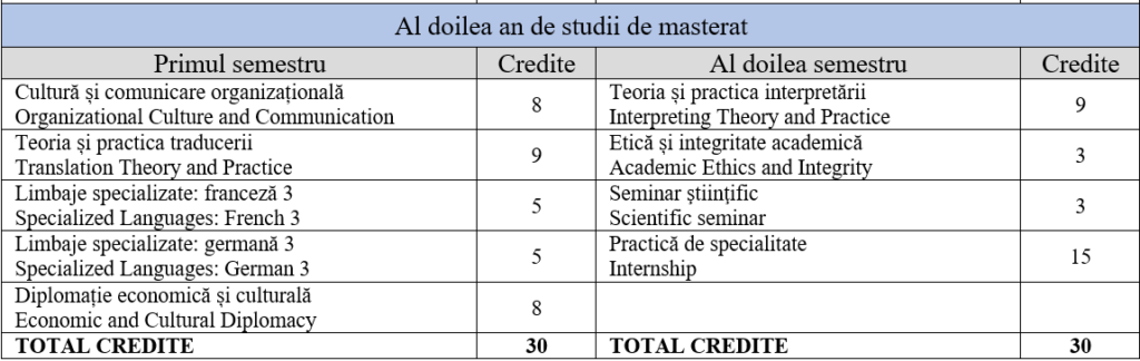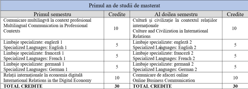 Planul de învățământ conține discipline predate în limba engleză despre comunicare organizațională în varii contexte profesionale multilingve, cultură și civilizație în contextul relațiilor internaționale, traducere și interpretariat într-un mediu de lucru internațional, relații economice internaționale, diplomație economică și culturală; limbaje specializate în limba engleză (obligatoriu), și limbaje specializate în limba franceză sau germană (la alegerea studentului).